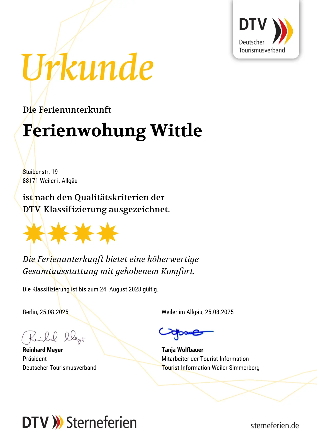 Beitrag veröffentlicht:August 25, 2025 Beitrags-Kategorie:Auszeichnungen Heute haben wir unsere 4 Sterne des deutschen Tourismusverband erhalten.